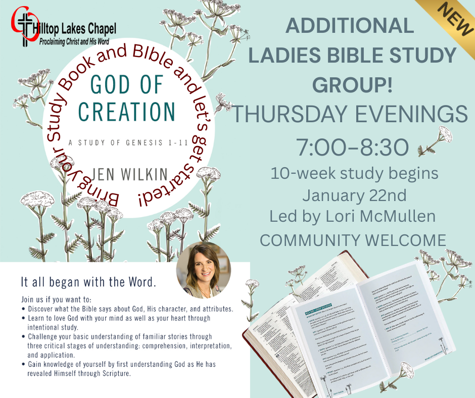 Our Ladies Bible Study will be embarking on a new study this January. Join us for “God of Creation” by Jen Wilkin. Our study begins January 12th and meets Mondays at 10:00am. Nursery is available for 4 and under.